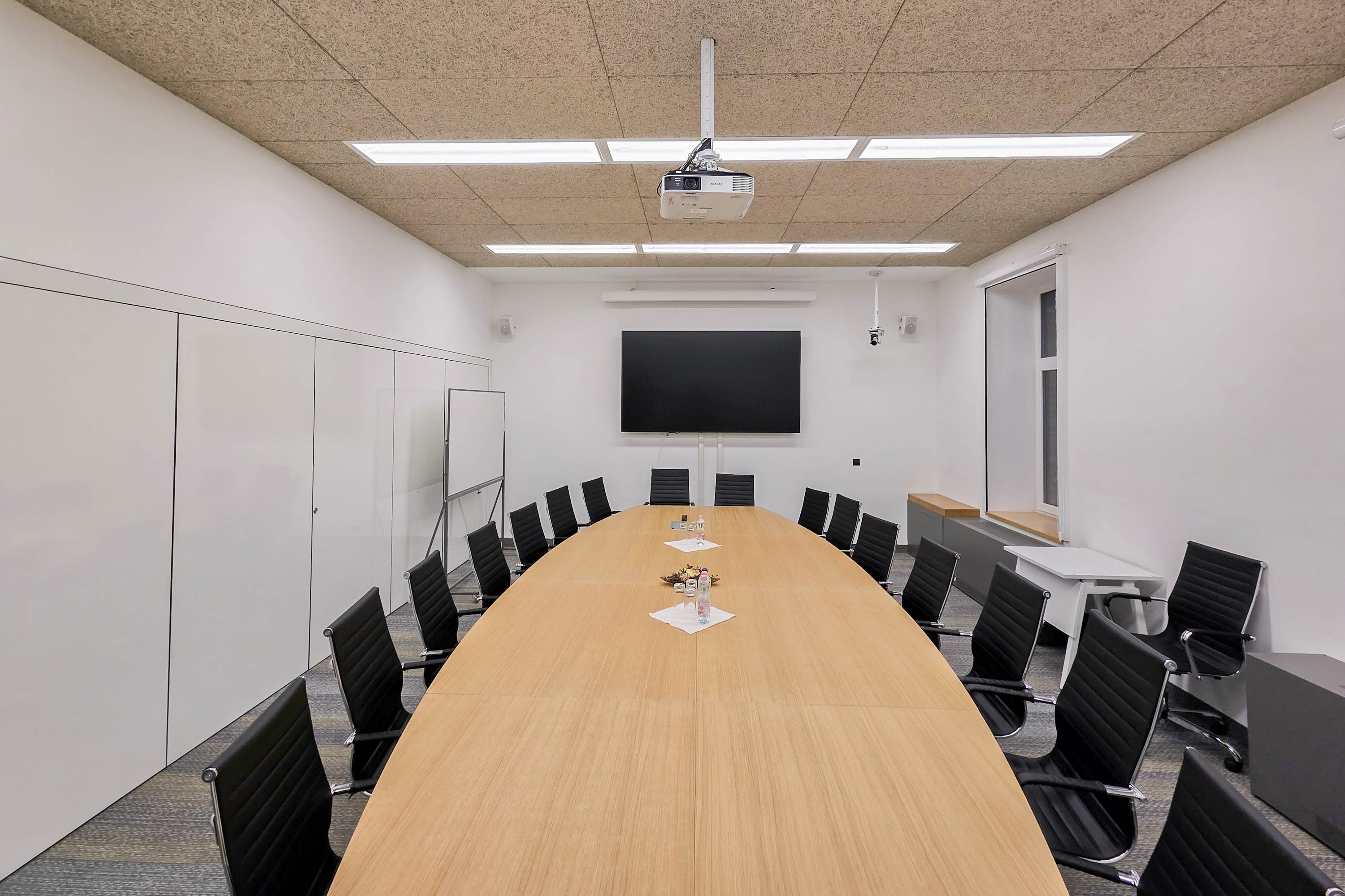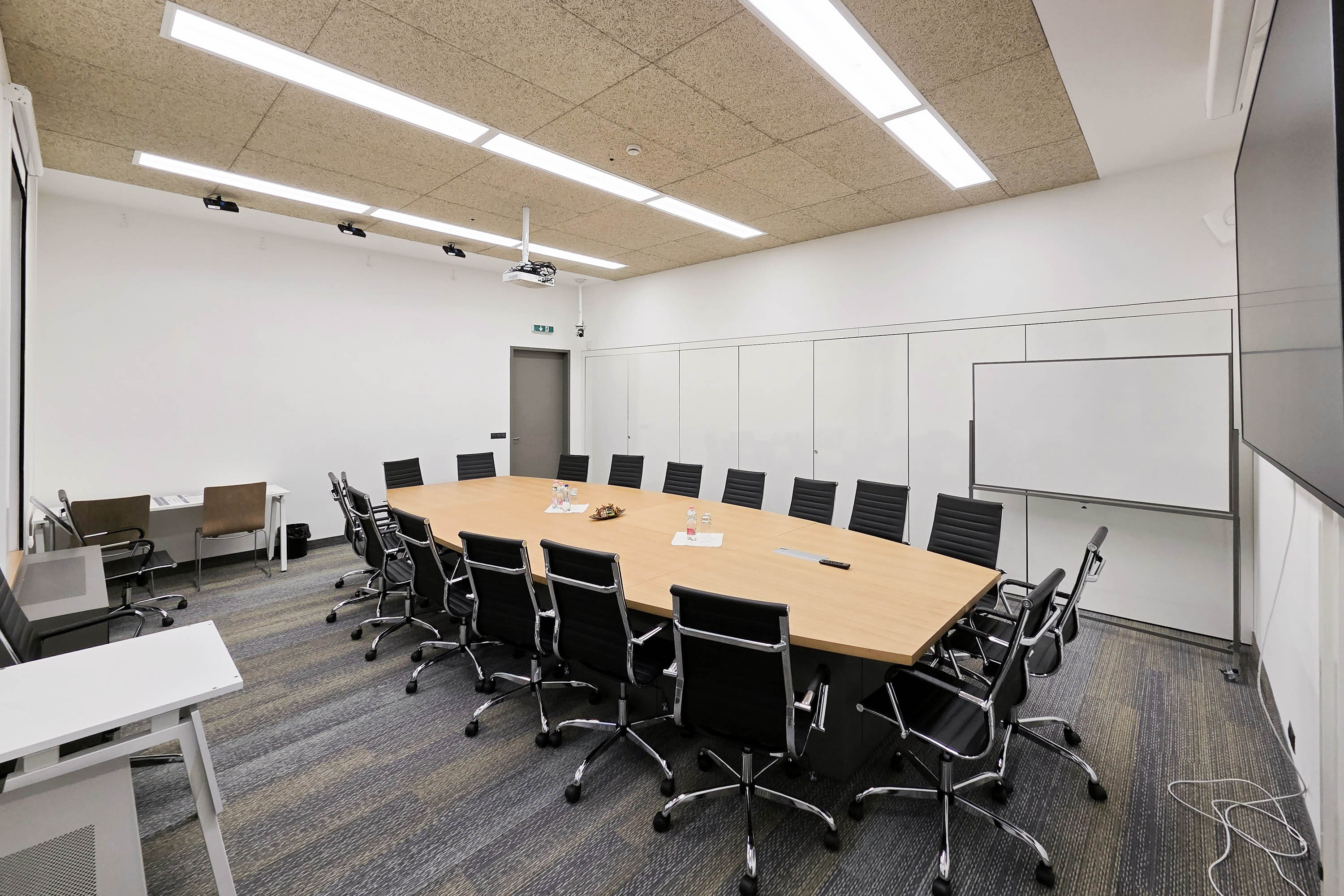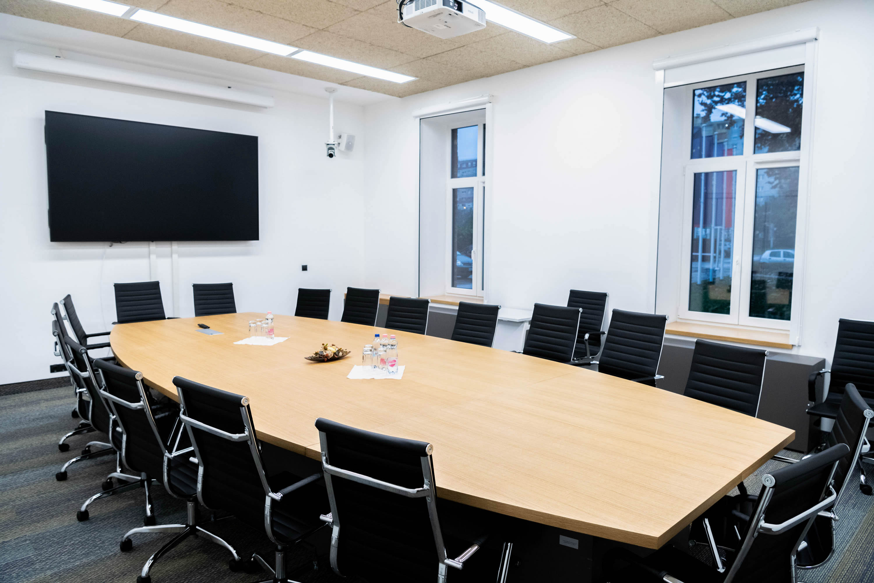 A reprezentatív tárgyaló elegáns, ovális kialakítású tárgyalóasztallal és 20 kényelmes székkel várja a résztvevőket, így kiválóan alkalmas nagyobb megbeszélések, stratégiai egyeztetések vagy üzleti prezentációk lebonyolítására.