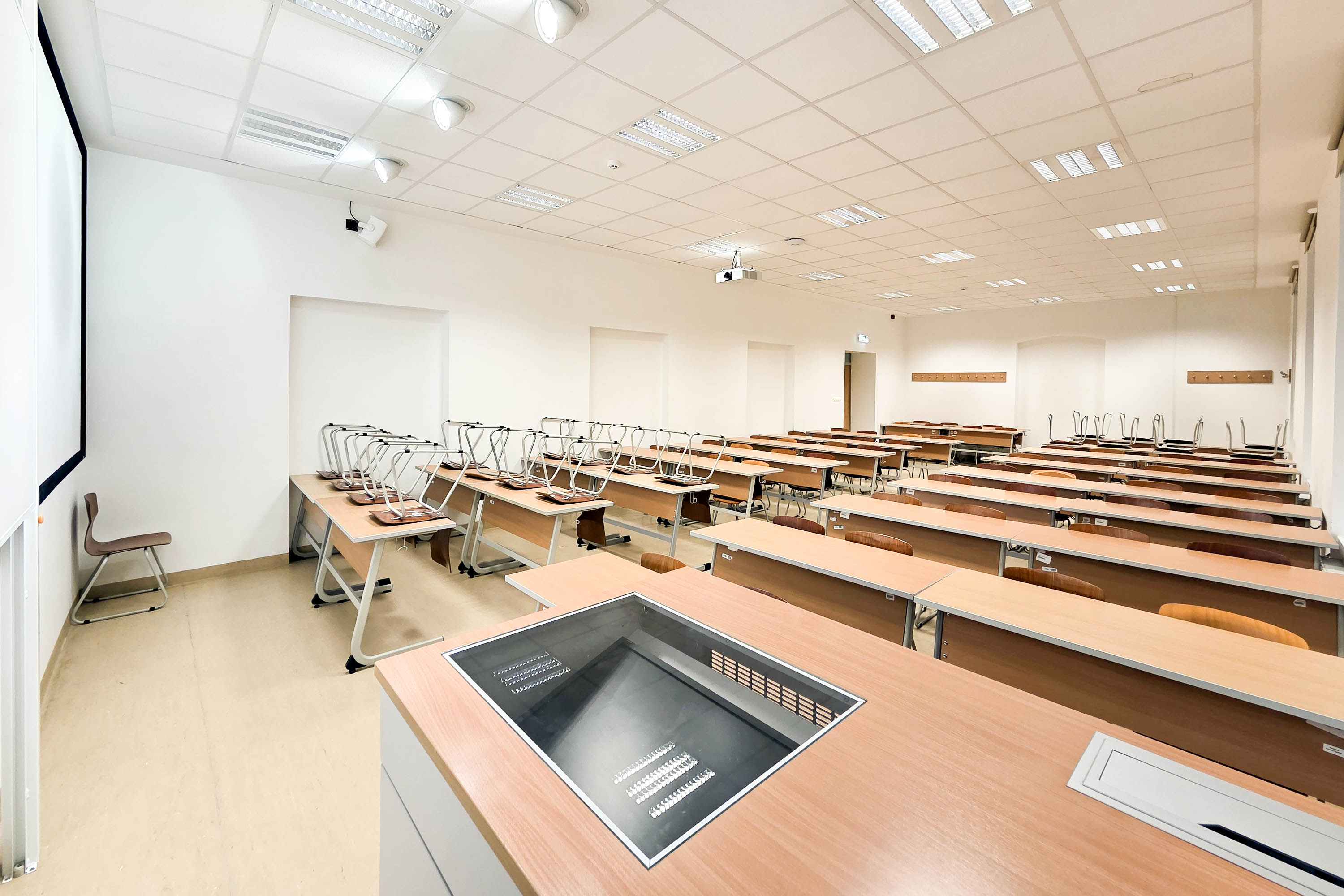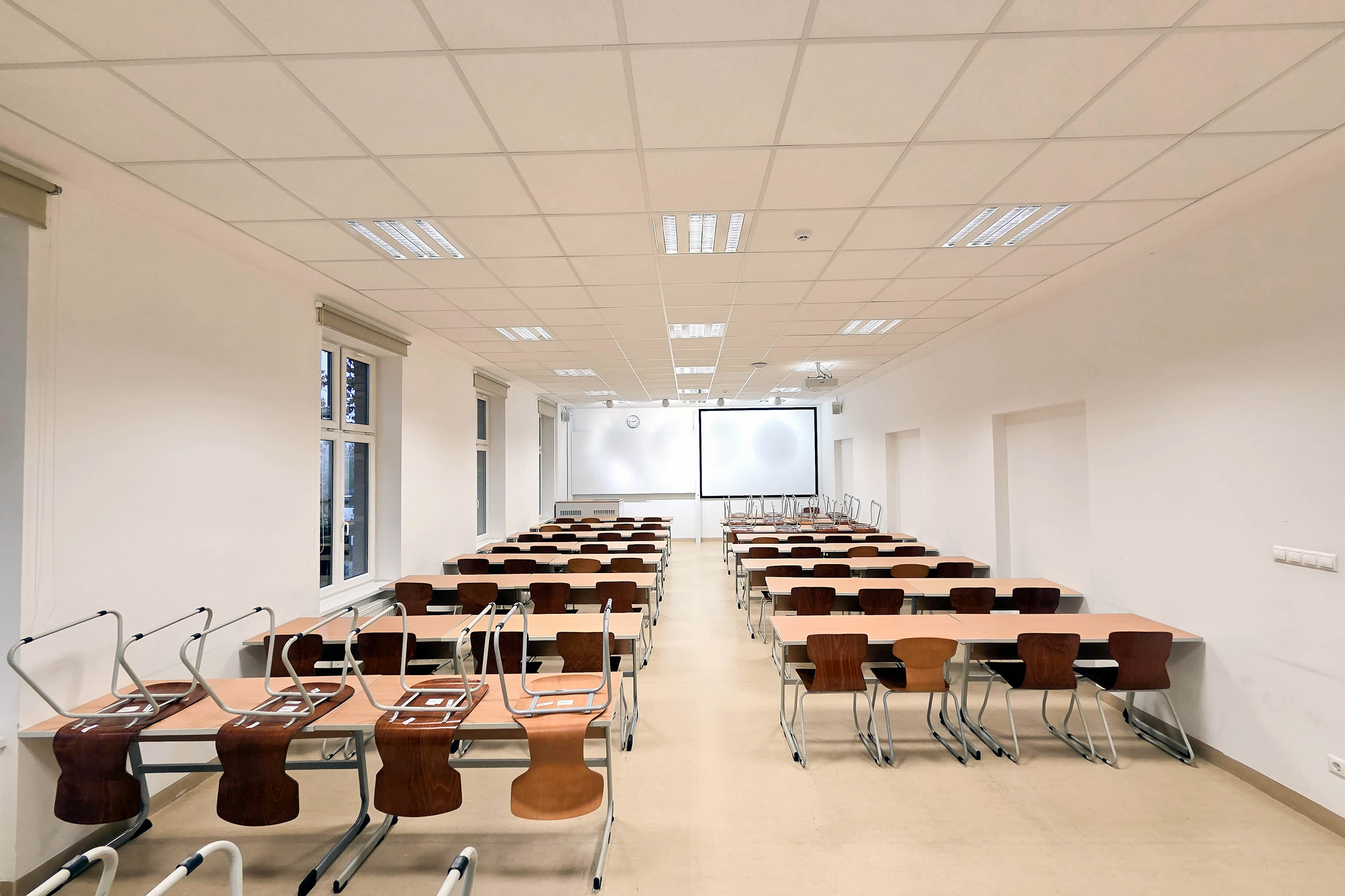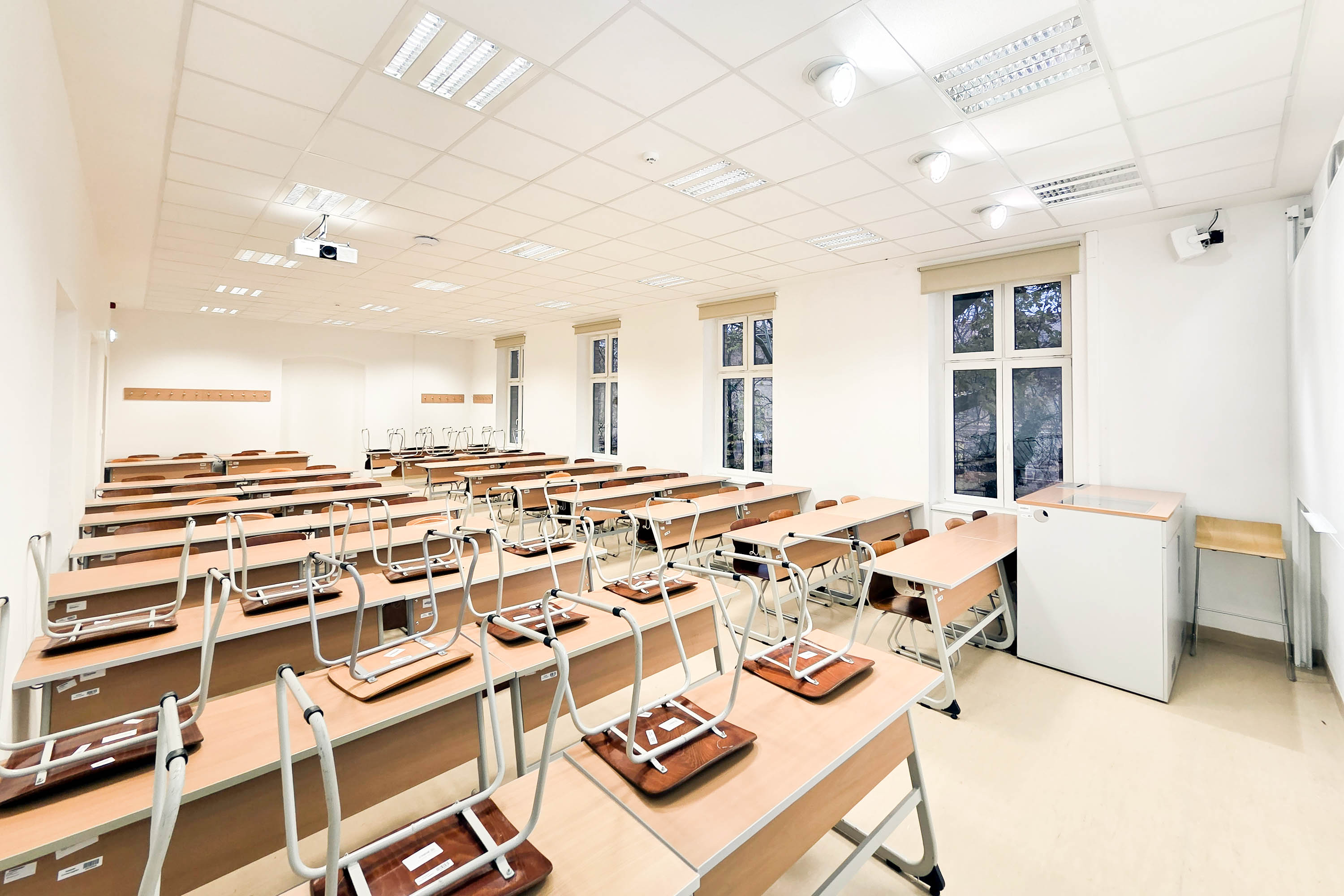 A Budai út 43. szám alatti oktatótermeink 40–60 fő számára biztosítanak kényelmes elhelyezést, és rugalmasan alakítható, mozgatható iskolapados berendezéssel rendelkeznek. Kiválóan megfelelnek kiscsoportos foglalkozások, nyelvi órák, tanfolyamok, szakképzések, valamint vitaestek vagy szekcióülések megtartására is.